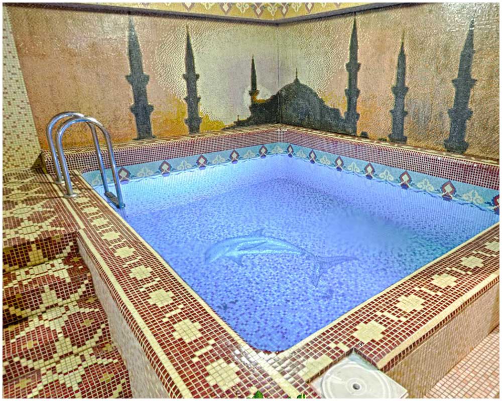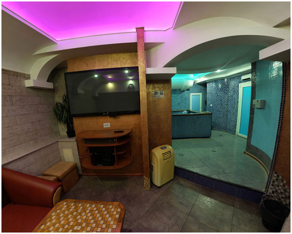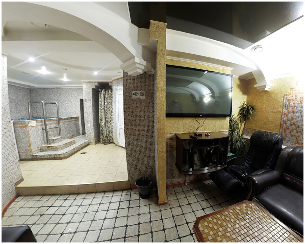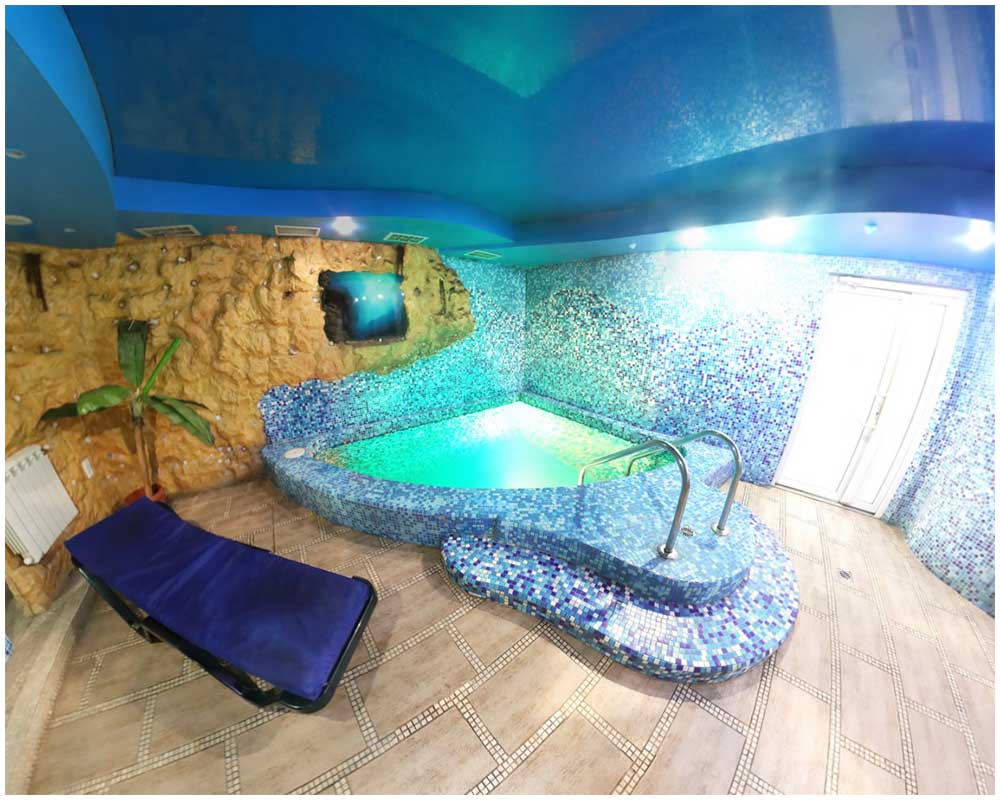 В номере «БАССЕЙН» есть: три парные, уникальная соляная сухая финская (120 градусов) с цветной подсветкой и музыкой, влажная римская (45 градусов) и инфракрасная (75 градусов), бассейн с фильтрацией и цветной подсветкой с холодной водой, комната отдыха с мягким уголком, столом, телевизором 60″, две отдельные массажные комнаты с мягкими кроватями, массажное кресло, услуги бара, кальян, дубовые и березовые веники, массаж. Работает бесплатный интернет WiFi.